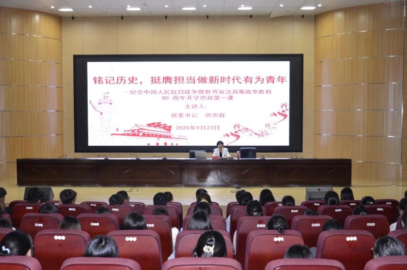 9月23日,大理护理职业学院党委书记廖惠群为师生讲授纪念中华人民抗日战争暨世界反法西斯战争胜利80周年开学思政第一课,激励学生深刻领悟和自觉传承赓续“天下兴亡、匹夫有责的爱国情怀,视死如归、宁死不屈的民族气节,不畏强暴、血战到底的英雄气概,百折不挠、坚忍不拔的必胜信念”的伟大抗战精神,勇担青春时代使命。