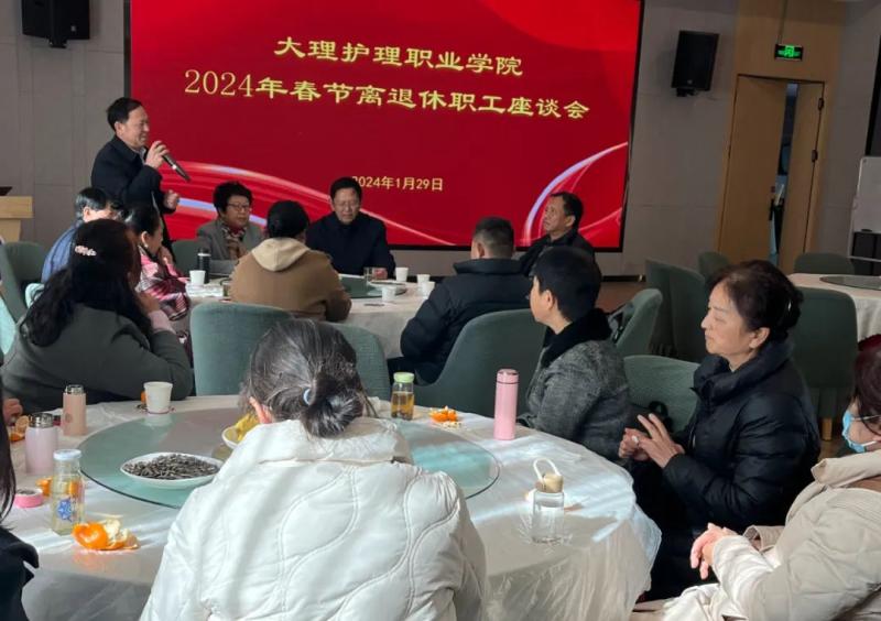 暖阳藏春,岁月沉香。1月29日下午,在新春佳节即将到来之际,大理护理职业学院组织召开2024年离退休教职工迎新春座谈会。学校党委领导班子成员与学校离退休教职工欢聚一堂,共话学校建设发展,展望学校美好未来。学校党委专职副书记字利鹏主持会议。