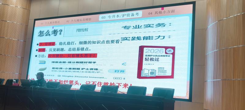 活动特别邀请优秀校友刘倚彤重返校园,以“求学与职业发展”为主题开展专题讲座。她结合自身成长历程,分享了个人规划、专升本备考、护士执业资格证备考、职业素养培育等方面的实操经验,用真实案例为同学们答疑解惑。在讲座过程中,同学们专注聆听、认真记录;在互动交流环节中,大家踊跃举手提问,围绕学业规划、职业转型等困惑与校友深入探讨。刘倚彤结合自身实践逐一细致解答,为同学们提供了切实可行的参考建议,现场氛围热烈融洽。