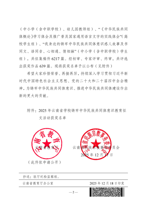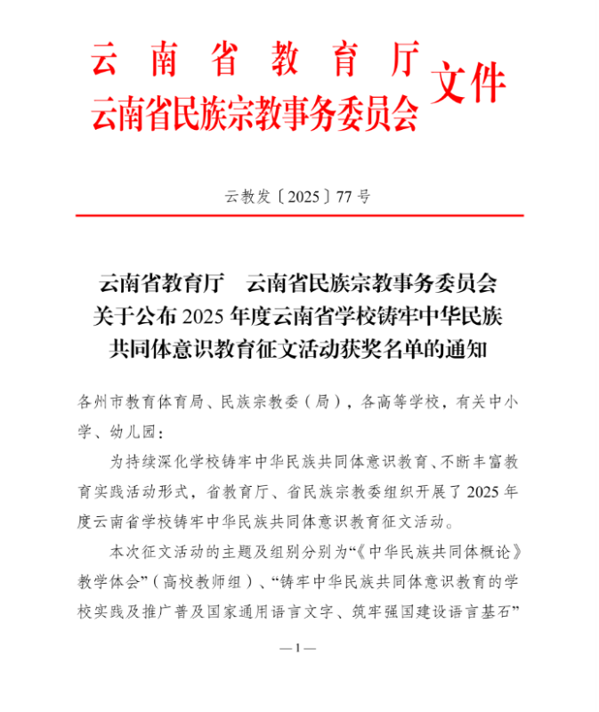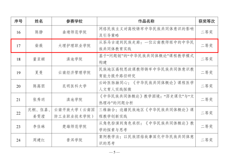 近日,2025年云南省铸牢中华民族共同体意识教育征文评选结果正式揭晓,大理护理职业学院马克思主义学院教师柴薇撰写的《从茶马古道到民族走廊:一位云南教师眼中的中华民族共同体意识的影响及引导策略》凭借鲜明的主题立意、扎实的理论功底与生动的实践思考,从高校教师组576篇参赛作品中脱颖而出,最终在 59 篇获奖作品中斩获二等奖!
