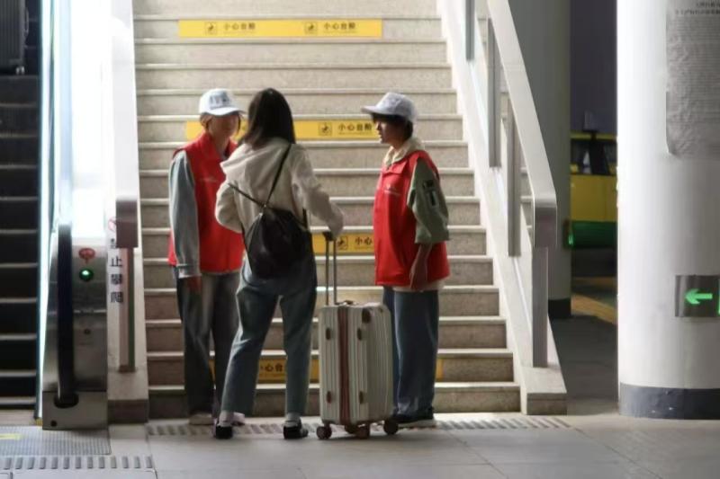 志愿者们以饱满的热情投身岗位,耐心解答旅客疑问,协助老年乘客使用智能设备,为母婴群体开辟绿色通道,用细致入微的服务践行着“奉献、友爱、互助、进步”的志愿精神。