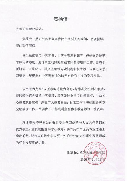 近日,大理护理职业学院收到一封来自曲靖市沾益区大坡乡卫生院的表扬信,信中对康复技术系中医康复技术2502班学生孙春雨,在2026年寒假大学生“返家乡”社会实践暨大学生实习“扬帆计划”活动中的优异表现“点赞”。