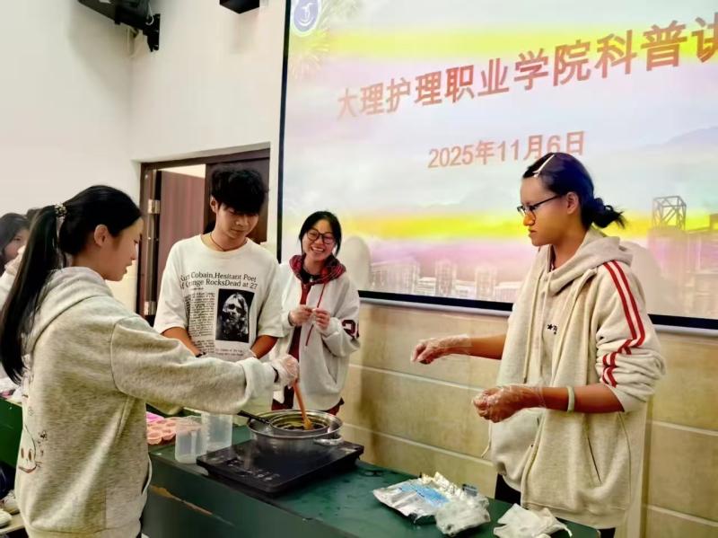 11月6日,大理护理职业学院邀请大理市第一人民医院药学部主任聂彩霞主管药师团队,为药学和中药学两个专业学生开展甲流防控专题科普讲座,开展手工皂制作、酸梅汤熬制等沉浸式科普实践活动,以“理论宣讲+实操体验”的创新形式,为师生们打造了一场兼具专业性、实用性与趣味性的医药科普盛宴。