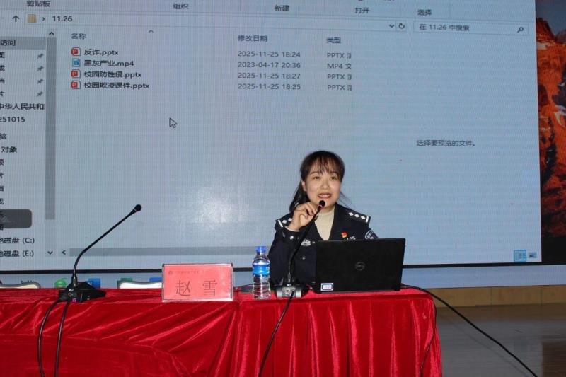 11月26日,大理护理职业学院特邀大理市公安局刑侦大队新型网络犯罪侦查中队民警赵雪,为全校师生带来一场主题鲜明、内容翔实的预防电信诈骗暨安全法制教育专题讲座。进一步强化校园安全防线,提升学生法治观念与自我保护能力,营造平安和谐的育人环境。讲座由学生科副科长张小蓉老师主持,全校3900余名师生在第一报告厅和班级教室,通过线上线下聆听了讲座。