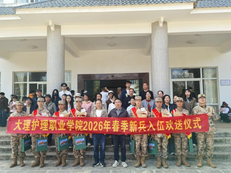 3月20日下午,大理护理职业学院在大理市民兵训练基地隆重举行2026年上半年入伍学生欢送仪式,为即将踏入军营的6名学子壮行。学校党委专职副书记字利鹏,辅导员、班主任代表,入伍学生家长及带教教官共同出席了仪式,见证了这一光荣时刻。
