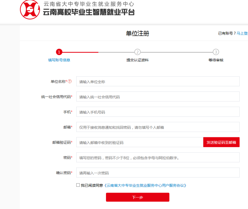 单位在网站“单位登录”-马上注册页面填写相应信息上传认证材料后提交,待学校审核通过后即可进行招聘会报名定展等后续操作。