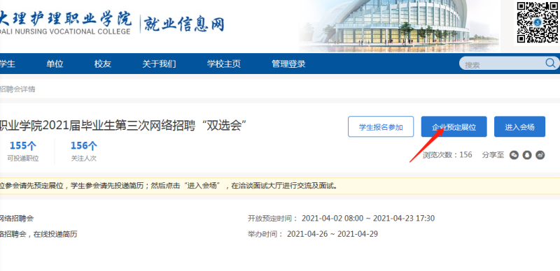 用人单位报名方式:登录大理护理职业学院就业信息网(网站网址:http://dlhlzyxy.jysd.com/),或扫描上方二维码登录。登陆后的后续操作详见附件1。